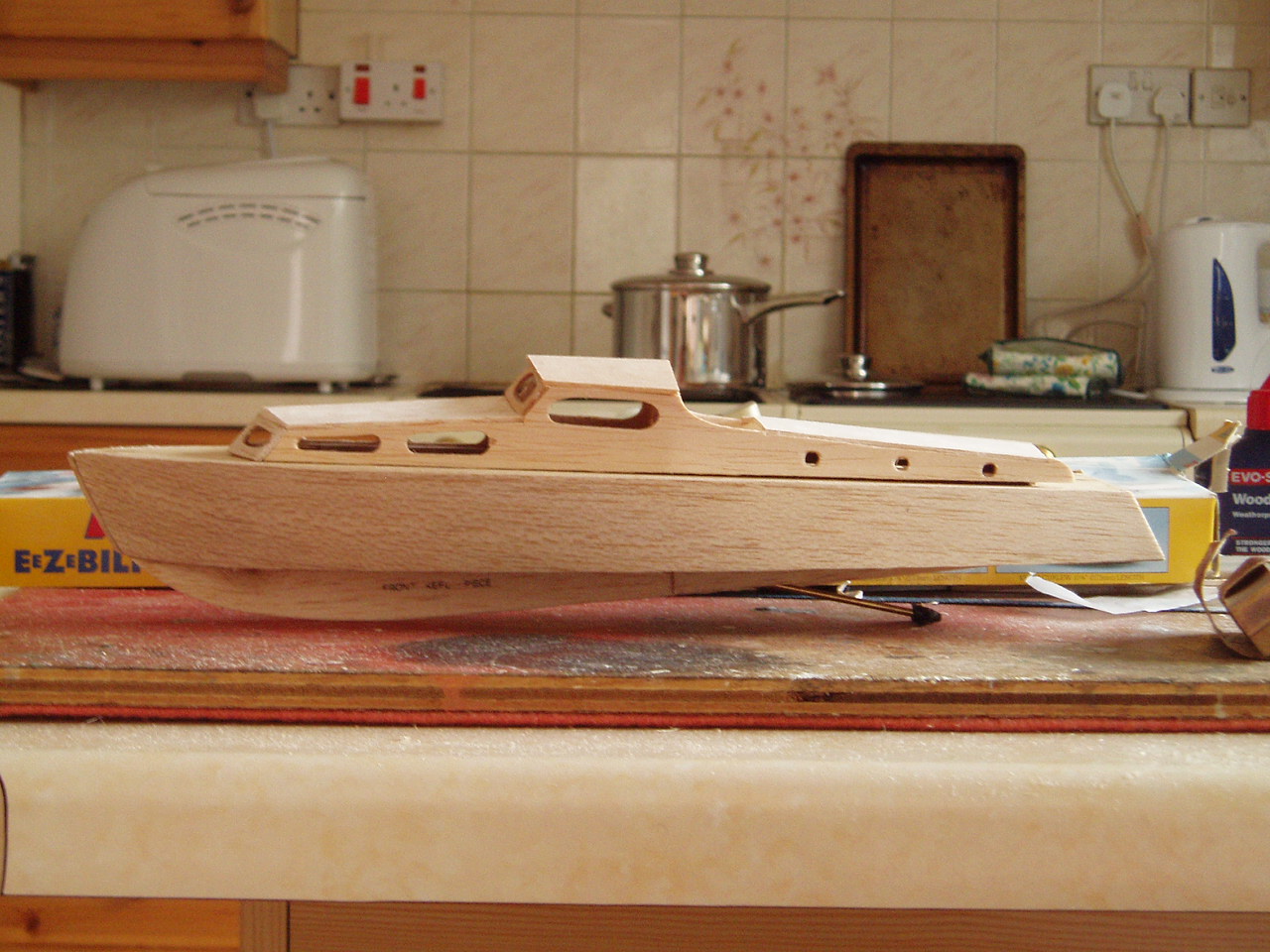And here is a photo of the inside layout. The motor is a cheap Mabuchi, speed controller is 15 amp Mtronix, and the battery is a AAA 4.8 pack of NiMhs. The receiver is a 2 channel Futaba BEC system, the propellor is 3/4 inch diameter, home-made in brass as is the rudder, and the propshaft is from SHG marine.