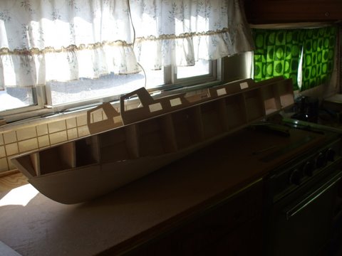 For sealing the wood prior to painting I used a solution of PVA glue and water 50/50 mix, three coats sanded between each coat leaves a nice hard smooth surface and also takes care of any stray pin holes, so now the boat has had its first coat of primer.